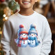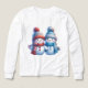 A pair of adorable snowmen wearing warm knitted hats and scarves in a snowy winter theme.