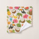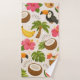 Playful tropical summer pattern with toucans, palm trees, coconuts, hibiscus flowers, pineapple, banana, watermelon, seashells, starfish and colorful cocktails on light background