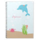 Ce carnet a un adorable thème de fille sous la mer. Sur la droite, un mignon dauphin nage à l'hippocampe accroché à quelques algues au fond. En bas à gauche, il y a un petit crabe mignon au fond de l'océan. Au milieu, vous pouvez facilement personnaliser ceci avec un nom. Quelques éléments de design par STOCKBERRY STUDIO