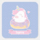 Un autocollant personnalisé qui présente une licorne blanche à la crinière rose au milieu d'un beignet délicieux avec beaucoup de givre violet et des arcs-en-ciel arrosés dessus. Étoiles et coeurs motif arrière - plan. Illustration fantaisiste et kawaii pour les filles qui aiment les licornes et les desserts sucrés !