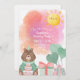 A charming watercolor birthday invitation featuring a sweet bear with a cake, heart balloons, and a smiling sun. Perfect for toddlers, girls, and boys. Fully customizable with your party details.