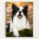 A black and white border collie is is lying in the forest.