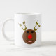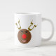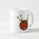 Cette énorme tasse présente un dessin humoristique d'un Reindeer. Il a les yeux noirs et un énorme nez rouge vif et brillant. Les bois pointent vers le haut et semblent futuristes faisant de ce renne un cyber renne. Il est toujours mignon et amical.