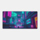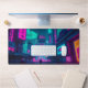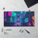 Upgrade your ultimate battle station or programming desk with this epic neon sci-fi computer accessory. This high-quality desk pad showcases a breathtaking view of a futuristic cyberpunk city street at night, illuminated by intense magenta and cyan neon signs. The lone figure facing the glowing metropolis perfectly captures the vibe of immersive role-playing games and dystopian tech noir films. With designated dark space at the bottom, this template is fully ready for you to add your custom gamer tag, streaming channel name, or a funny IT quote, creating a truly unique piece of gear.