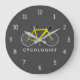 Texte cyclologue avec vélo jaune sur arrière - plan gris foncé.