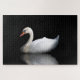 Cygne muet blanc flottant dans un lac avec réflexion dans l'eau contre arrière - plan noir. Clé basse.