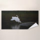 Photo d'un cygne blanc qui s'étire sur ses ailes en marchant dans une rivière peu profonde. Copyright ©2019 Kimberly J Tilley