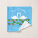 Ce superbe linge de toilette a une image art numérique d'une paire de beaux cygnes blancs avec des becs orange qui se font face et ressemblent à des baisers. Sous les cygnes se trouve un ensemble de jolies fleurs de lys d'eau rose avec des centres jaunes et des coussins de lys verts. Un beau design mariage. Il y a du texte personnalisé pour que vous puissiez inclure les noms du couple heureux et un message.