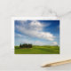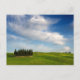 Carte postale d'un groupe de cyprès dans un paysage de collines vertes et de fleurs jaunes sous de beaux nuages blancs près de Torrenieri dans le Val d'Orcia (vallée de l'Orcia) en Toscane, Italie.