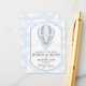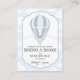 Un nuage bleu et blanc avec une montgolfière aux accents argentés à la parties scintillant apporte un design de carte de livre pour un baby shower garçon.