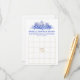 Ce jeu est sûr d'être un succès à votre douche. Les invités écrivent dans les articles qu'ils pensent que vous les recevrez et les traverserez pendant que vous ouvrez vos cadeaux. Le design comprend un bouquet floral bleu et blanc avec un set de thé sur le bord supérieur. Le carré libre a une bague mariage.
