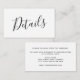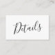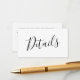 Black Script Calligraphy Détails du Mariage Enclôture Card, pour ces dernières minutes de détails supplémentaires sur votre grand jour. Un design simple qui peut aller avec votre mariage invite. Également disponible en arrière - plan noir. Appuyez sur "personnaliser plus loin" pour ajuster la taille de police si nécessaire.