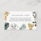 Customisez cette carte de boîtier pour vos besoins ! Idéal pour les détails, les informations sur le registre, l'hébergement à l'hôtel, etc. Doté d'animaux de safari en aquarelle et de feuilles de jungle tropicale. Parfait pour un baby shower ou un anniversaire.