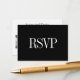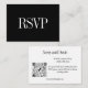 Carte de boîtier RSVP de mariage 3,5 x 2,5 élégant avec code QR dirigé vers le site Web mariage. Disponible avec notre Faire-part de mariage moderne chic noir & blanc.