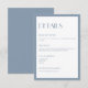 Cette carte de détails est conçue dans une magnifique couleur bleu poussiéreux, dans un style épuré et moderne. Cela fait un ajout parfait et inestimable à tout ensemble de papeterie mariage afin que vous puissiez informer vos invités de tout ce qu'ils pourraient avoir besoin de connaître sur votre prochain mariage. Les détails peuvent être n'importe quel de votre choix, ceux que j'ai inclus sont de servir d'exemples seulement.