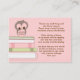 Une adorable petite chouette rose perche au-dessus d'une pile de livres roses et verts sur un arrière - plan à motifs de pois. Un poème charmant demande aux clients d'apporter un livre pour le futur bébé pour commencer la nouvelle maman avec une bibliothèque de livres pour enfants bien-aimés. Il suffit d'insérer cette carte sucrée dans l'enveloppe du baby shower, et vos invités sauront ce qui est nécessaire pour commencer bébé sur le chemin de la lecture.