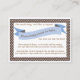 Un poème charmant demande aux clients d'apporter un livre pour le futur bébé pour commencer la nouvelle maman avec une bibliothèque de livres pour enfants bien-aimés. Il suffit d'insérer cette carte douce dans l'enveloppe du baby shower, le design de pois bleu et marron est parfait pour coordonner avec à peu près n'importe quelle invitation de douche bébé garçon aussi.