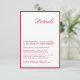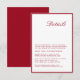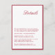 La Carte de Détail Mariage Rouge de Calligraphie moderne est un ajout chic à votre suite de papeterie mariage. Avec une calligraphie élégante et fluide associée à un design rouge vif, cette carte de détail offre à vos invités des informations essentielles dans un format élégant. Parfait pour partager des détails tels que l'itinéraire, l'hébergement à l'hôtel, la chronologie mariage et le code vestimentaire, cette carte vous assure que vos invités sont bien préparés pour votre journée spéciale. Son design sophistiqué est magnifiquement cravate avec un mariage sur le thème rouge, ajoutant une touche de classe et de clarté. Imprimées sur des cartons de haute qualité, nos cartes de détail offrent un look et une sensation luxueux qui impressionnent vos invités. Que vous planifiez un rassemblement intime ou une grande fête, cette carte vous donnera une impression durable et vous assurera que vos invités ont toutes les informations dont ils ont besoin pour profiter pleinement de votre jour de mariage. Faites une déclaration avec votre papier à lettres mariage et améliorez la sophistication de vos détails mariages avec notre carte de détail minimaliste de script moderne Mariage. C'est le choix idéal pour les couples qui apprécient le design épuré et contemporain et veulent que leur papeterie reflète leur goût raffiné