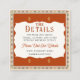 La carte de détails de mariage Old West Frontier comporte un cadre de style rustique de l'ancien ouest sur le devant de la carte et est prête à recevoir vos informations de mariage personnalisées. Les belles couleurs chaudes rouges, bronze et cuivre rappellent une couverture de cheval western évocatrice du style de l'ancien ouest et ajoutent à la romance de l'ancien ouest. Cette carte de détails fait partie de notre belle collection de mariage sur le thème rustique de l'Old West Frontier. Découvrez la papeterie coordonnée, l'invitation, la carte de réponse et les enveloppes assorties pour compléter votre mariage western sur le thème de l'Old West Frontier.