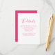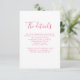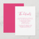 La carte d'insertion des détails du mariage présente une police d'écriture élégante associée à une conception typographique moderne et épurée. La couleur rose chaud se prolonge au verso de la carte. Cette pièce est prête à être personnalisée avec les détails de votre jour spécial. Faisant partie d'une collection en constante évolution, veuillez parcourir la collection de mariage à l'aquarelle florale rose élégante pour les articles complémentaires.
