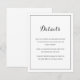 Une carte de détails de mariage moderne et élégante. Cette conception comprend une police de script élégante pour le titre, et une police sans-serif simple et claire pour le corps du texte. Les couleurs affichées sont noires. Ceux-ci, ainsi que les polices, peuvent être customisés entièrement à votre goût. Si vous avez besoin d'autres articles correspondants, ou si vous avez des questions, n'hésitez pas à nous contacter.
