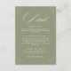 Améliorez votre suite de mariage avec notre carte de détails de mariage Olive Green 'Élégance Intemporelle'. Avec un fond olive vert serein et une typographie raffinée, cette carte transmet de manière élégante les informations essentielles telles que les hébergements, le programme et plus encore. Parfaite pour un mariage moderne mais naturel.