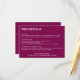 Mulberry Wine QR Code Détails du Mariage Carte, s'il vous plaît personnaliser en utilisant le modèle de personnalisation en ligne avant de commander. Veuillez modifier l'URL affichée dans le modèle pour afficher l'URL de votre propre site mariage (pour le code QR à l'arrière), puis personnalisez la liste à l'avant (Réception, Hébergement, Transport ou autres détails utiles à vos invités) et la date de réponse dans la note à l'avant. Le verso de la carte est une couleur de vin mûrier ordinaire à l'exception du code QR, cependant si vous devez ajouter quelque chose de plus à l'arrière de la conception ou faire d'autres ajustements supplémentaires alors vous pouvez cliquer sur le bouton "Modifier en utilisant l'outil de design" pour "customiser plus loin"; ce bouton est disponible en défilant dans le modèle de personnalisation en ligne. L'avant de la carte de boîtier présente un texte blanc élégant, tandis que l'arrière de la carte comporte un code QR en noir et blanc (de sorte qu'il est facile pour le code QR d'être scanné par un invité avec un téléphone moderne).