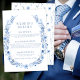 Elégante couronne fleur sauvage bleu marine, minuscule jardin fleuri, grange ou ranch carte de détails mariage.