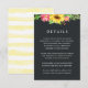 L'avant de la carte est décoré de tournesols sur le dessus avec des pops de fleurs roses et de verdure. Modifiez tout ou partie du texte. Vous pouvez ajouter tous les détails dont vous avez besoin, par exemple : informations sur la réception, événement réservé aux adultes, adresse du site Web, informations sur le registre, hébergement, code vestimentaire, bar à billets, etc. L'arrière de l'invitation a un motif rayé jaune clair. Cette carte correspond à une collection dans mon magasin.
