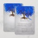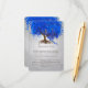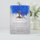 Mariage conte de fées magique et fantaisiste. Arbre à feuilles bleu royal sur papier métallisé argenté teinté de thé avec une superposition de partitions de musique anciennes et quelques jolis motifs tourbillonnants pour mettre en valeur les racines de l'amour sur cette carte de mariage unique en son genre dans un style forestier