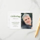 Cette élégante carte de prière photomémoriale, en texte vert et noir, est une belle façon de se souvenir d'un être cher pendant la célébration du service de la vie. Cela fait un beau souvenir que vos invités peuvent afficher dans leur maison après.