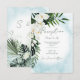 Ce design de carte de réception de mariage présente une belle végétation tropicale luxuriante et des fleurs blanches sur un arrière - plan d'eau bleu aqua des Caraïbes doux. Parfait pour la destination ou le mariage sur la plage. Créé par Simply Farmhouse Press.