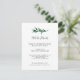 Conçue pour coordonner avec notre collection de mariages Palm Wreath, cette carte d'information botanique verte fraîche dispose d'une seule feuille de palmier en vert riche aquarelle, surplombant vos principaux détails mariages, comme les chambres d'hôtel, les informations de bienvenue de la réception, le site Web et plus encore. Ajoutez votre texte personnalisé à l'aide des champs fournis et utilisez la fonction Personnaliser pour ajuster les polices, les tailles et l'espacement.