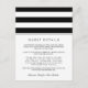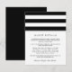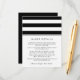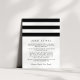 Conçue pour coordonner avec nos collections de faire-part de mariage en noir et blanc Metro Stripe, cette carte simple et chic présente des lettres noires classiques avec de larges rayures noires et blanches en haut. Remplacez l'exemple de texte par les détails clés de votre célébration mariage. Vous vous demandez quelles informations inclure sur un encart faire-part de mariage ? Prenez en compte des détails comme l'hébergement à l'hôtel, les codes de groupe, le transport, les informations sur la réception de bienvenue, et votre URL du site Web mariage.