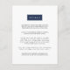 Élégantes, chic et modernes, ces inserts de faire-part de mariage ultra-modernes comportent des "Détails" placés sur un élément rectangulaire qui peut être customisé par un clic de bouton pour correspondre à vos couleurs mariages. Remplacez l'exemple de texte par les détails clés de la célébration de votre mariage, puis ajustez la couleur à votre préférence en utilisant les instructions simples ci-dessous. Les cartes sont inversées à un motif à clé grecque moderne en option. Montré en bleu marine classique et blanc. Vous vous demandez quelles informations inclure sur un encart faire-part de mariage ? Prenez en compte des détails comme l'hébergement à l'hôtel, les codes de groupe, l'itinéraire, le transport, les informations sur la réception de bienvenue et l'URL de votre site Web mariage. POUR MODIFIER LA COULEUR : - Cliquez sur "Customiser" - Sélectionnez une nouvelle couleur dans la palette, ou cliquez sur l'icône du curseur, puis sur "Avancé" pour accéder au spectre de couleurs complet et à un champ de code hexadécimal pour une personnalisation finale. - N'oubliez pas de changer la couleur du dos de la carte.