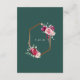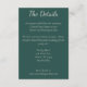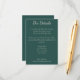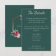 Cette carte de détails obligatoire comporte vos détails dans une police serif moderne. C'est l'endroit idéal pour noter des chambres et d'autres informations mariages pertinentes. L'arrière présente votre date mariage un cadre géométrique doré contre un arrière - plan vert foncé. Le cadre est accentué par des roses bordeaux, des pivoines roses et des plumes pour un toucher bohème.