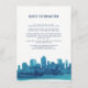 Cette carte d'insertion moderne et élégante présente une silhouette de ville peinte à l'aquarelle en bleu marine et sarcelle.