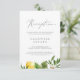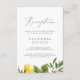 Cette carte moderne d'encart de réception au citron est parfaite pour un mariage de printemps ou d'été. Le design méditerranéen rustique présente de beaux citrons aquarellés aux fleurs blanches bohème et d'élégants feuilles verts. Personnalisez cette carte détaillée de boîtier avec vos informations de réception et incluez également votre adresse de site mariage !