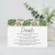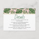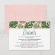 Feuilles tropicaux vert et or rose vif mariage détails insérer carte. Un joli design qui présente des feuilles de Fromage Leaf Philodendron (Monstera deliciosa) ou de Fromage Suisse Plante et feuilles de palme en vert avec contour d'or. Le fond est recouvert d'un motif à pois dorés rose. Choisissez-le pour votre plage tropicale côtière ou mariage de destination.