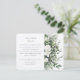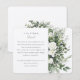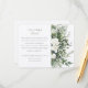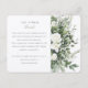 Cette carte d'enceinte est le complément parfait à une suite de faire-part de mariage, délicatement détaillée avec un bouquet de roses blanches sur un fond de verdure variée dans les tons d'eucalyptus, de l'omelette et de l'olive. C'est une pièce idéale pour partager ces "détails plus fins" de votre journée spéciale, des directions aux préférences de cadeaux. Le design épuré de la carte, avec sa typographie élégante, est un moyen gracieux de transmettre toutes les informations supplémentaires dont vos invités auront besoin, assurant une expérience sans faille pour votre événement méticuleusement planifié.