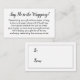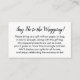 Si vous êtes l'hôte d'un baby shower d'affichage neutre et sans cadeau pour la future maman, cette carte simple pourrait être le choix pour vous. En utilisant une jolie police de script moderne, j'ai d'abord ajouté un en-tête qui annonce l'intention d'une façon légèrement décalée : "Dites non à l'enveloppement !" sur le devant, et "à" et "de" pour le côté de l'étiquette cadeau. Le champ modèle a été mis en place pour offrir des instructions aux clients qui ne mettent pas leur présent dans leur enveloppe. N'hésitez pas à modifier le libellé de la façon que vous souhaitez. Toutes les polices et les couleurs peuvent être modifiées à votre gré.