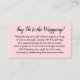 Si vous êtes l'hôte d'un baby shower d'affichage sans cadeau pour la future maman, cette carte simple pourrait être le choix pour vous. En utilisant une jolie police de script moderne, j'ai d'abord ajouté un en-tête qui annonce l'intention d'une façon légèrement décalée : "Dites non à l'enveloppement !" sur le devant, et "à" et "de" pour le côté de l'étiquette cadeau. Le champ modèle a été mis en place pour offrir des instructions aux clients qui ne mettent pas leur présent dans leur enveloppe. N'hésitez pas à modifier le libellé de la façon que vous souhaitez. Toutes les polices et les couleurs peuvent être modifiées à votre gré.