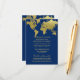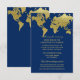La carte d'information du mariage présente une carte du monde. Elégant jeu de couleurs bleu marine et faux or feuille.