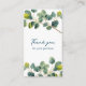 carte de boîtier élégant, avec une illustration d'aquarelle de branche d'eucalyptus fraîche. Le recto affiche un message "Merci pour votre achat" écrit à la main, tandis que le verso offre de l'espace pour vos coordonnées et une note personnalisée en polices épurées et minimalistes. Parfait pour les petites entreprises, les boutiques ou les boutiques artisanales, cette carte ajoute une touche naturelle et professionnelle à chaque commande.