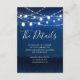 Ajoutez une touche d'élégance et de clarté à votre grand jour avec cette carte de détails de mariage String Lights Bleu et Argent. Conçue avec un mélange moderne de tons bleus profonds et d'accents argentés scintillants, cette carte fournit à vos invités toutes les informations essentielles sur le mariage dans un format magnifiquement organisé. Des guirlandes lumineuses délicates scintillent sur le dessus, créant une atmosphère romantique et festive qui complète parfaitement les mariages en soirée, en hiver ou les mariages formels. Que vous partagiez des informations sur l'hébergement, les directions, le code vestimentaire ou votre site web de mariage, cette carte assure que vos invités sont bien informés et se sentent les bienvenus. Entièrement personnalisable, cette carte de détails vous permet d'adapter le texte à vos besoins uniques. Associez-la sans effort à votre thème de mariage et à votre suite d'invitation pour une présentation cohérente et élégante. Caractéristiques du produit : Palette de couleurs bleu marine et argent élégante - Conception de guirlandes lumineuses romantiques pour un look festif - Espace pour l'hébergement, l'itinéraire et d'autres détails clés - Facilement personnalisable pour répondre à vos besoins spécifiques - Parfait pour les mariages d'hiver, de soirée ou modernes. Gardez vos invités inform