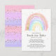 Design arc-en-ciel moderne avec un arc-en-ciel rose, violet et or avec des étoiles dispersées pour un baby shower pour filles. L'arrière de notre design a l'aquarelle rose & violet coups de pinceau avec parties scintillant or pour une touche spéciale supplémentaire.