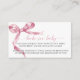 Bow Book pour Baby Encape Card - Un ajout sucré à vos invitations baby showers, demandant à vos invités d'apporter un livre spécial pour bébé. Doté d'un design d'arc rose doux et élégant pour une touche de charme. *** Veuillez saisir H121 dans la recherche de magasin pour trouver tous les articles correspondants *** Ou visitez notre collection de Baby showers pour filles en boue rose. *** Ce design de haute qualité est facile à customiser pour correspondre à vos couleurs, styles et thèmes mariages. Pour plus de personnalisation, cliquez sur le lien "Modifier en utilisant l'outil de conception" et utilisez notre outil de conception pour modifier ce modèle. Si vous avez besoin d'aide ou d'articles correspondants, veuillez me contacter.
