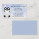 Une carte d'insertion de demande de livre pour le baby shower. Doté d'un pingouin d'aquarelle avec un poème : "UNE PETITE DEMANDE, NOUS ESPÉRONS NE PAS TROP DIFFICILE D'APPORTER UN LIVRE PLUTÔT QUE D'UNE CARTE ILS CHERCHERCHERONT LE LIVRE, BIEN AIMÉ OU NOUVEAU S'IL VOUS PLAÎT SIGNER L INSIMÉ AVEC UN MESSAGE DE VOUS!"