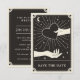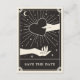 Cette carte Boho Save The Date présente un style de carte tarot céleste dans une palette de couleurs noir et crème. L'illustration montre une main tenant un coeur. L'arrière - plan a une lune et des étoiles scintillantes. Ce serait parfait pour toute personne ayant un Halloween ou un mariage à thème Éffrayant avec un thème palmiste ou révélateur de fortune.