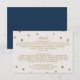 Cette carte de détails mariages pois or est parfaite pour un mariage élégant. Le design simple présente des confettis d'or chic sur un arrière - plan de champagne crémeux avec une belle calligraphie fausse feuille d'or et un fond bleu marine. Remarque : Ce design ne comporte pas de véritable feuille d'or. C'est un graphisme de haute qualité fait pour ressembler à du papier doré.